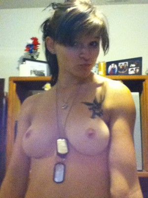 Zach 2011-03-04 at 3:03 PM 15 years ago WTF….every chick has pics with dog tags now? She does have great tits but that’s because she has to make up for her FUGLY face!